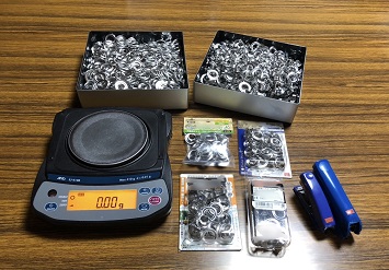 ブルーシートやスニーカー等に使用されているハトメを、計量→パック詰め(袋やケース)→もう一度計量→ホッチキス留め→箱詰めという、流れ作業で仕上げています。